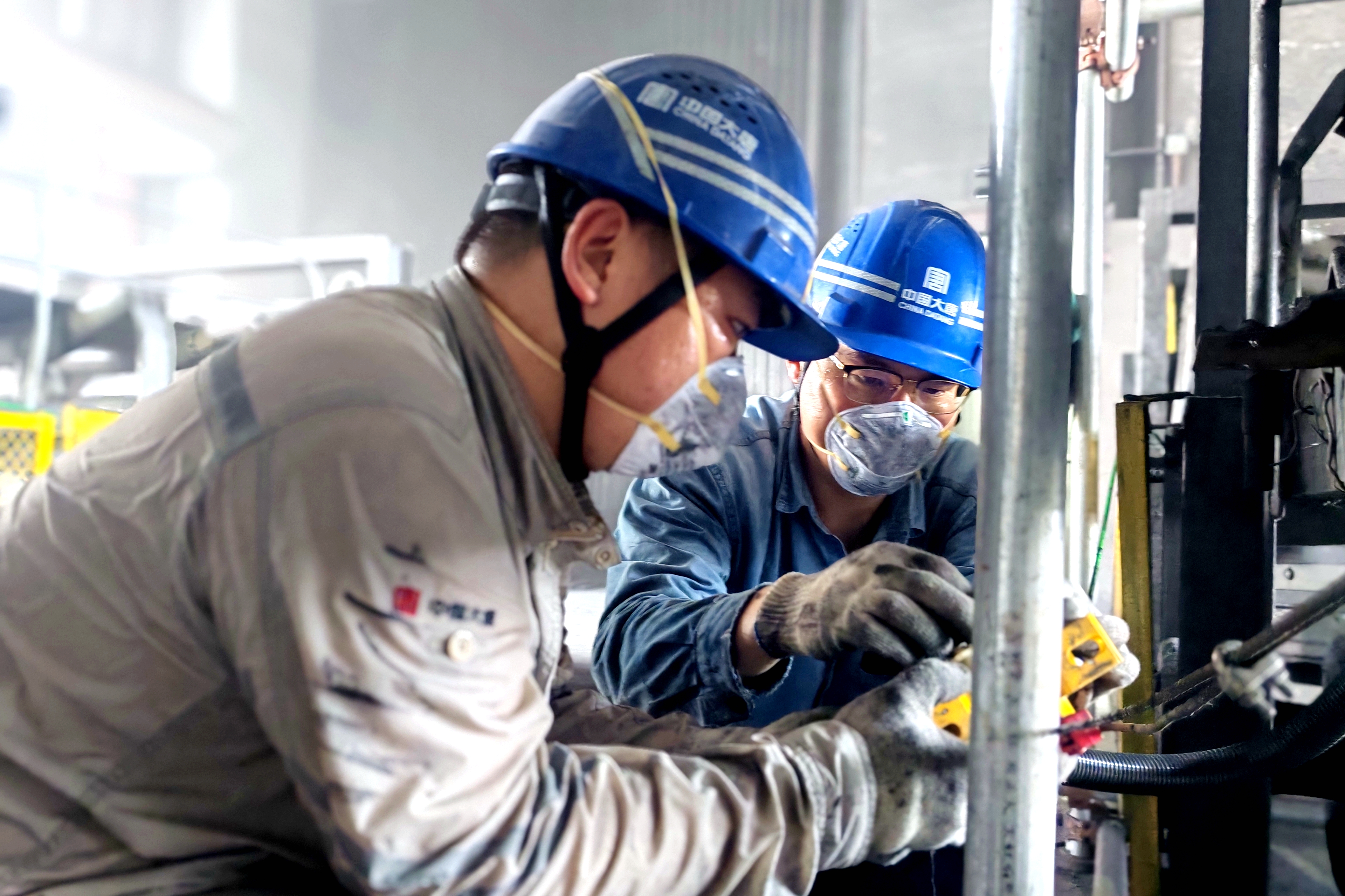 筒仓底部闷热异常,辅控班全员早已汗流浃背。张海峰熟练地操作角磨机,拆除旧电缆,防护服上沾满了粉尘;未纪牢一趟趟扛着沉重的镀锌管在狭窄空间里穿梭,工装后背凝结出盐霜;关兴昆钻入低矮的皮带架下,用冲击钻打孔、固定管卡,任凭汗水从脸颊滑落。