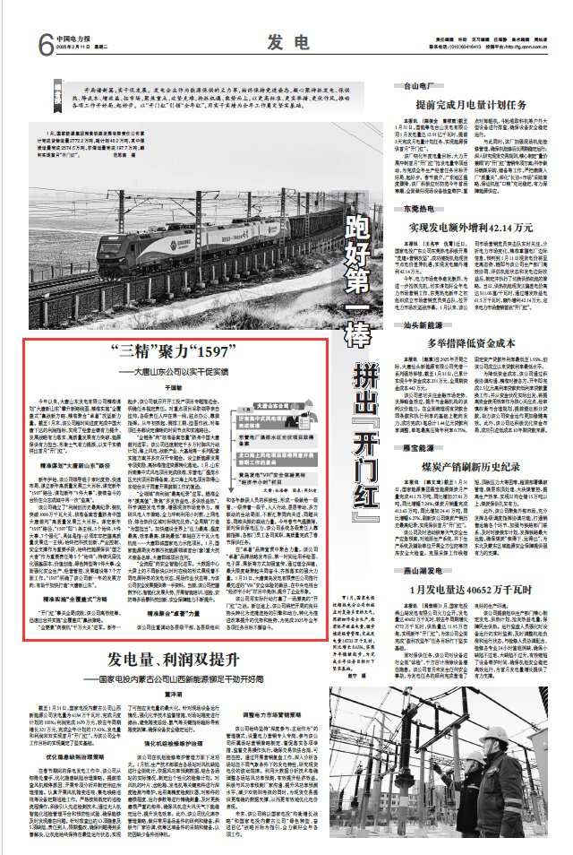 “全领域”向利润“最高纪录”进军。瞄准全年“摸高值”,聚焦“多发效益电、多供效益热”,科学调控发电节奏,增强现货市场竞争力。精研风电入市策略,全力冲刺利用小时数、上网电价、综合热价区域对标领先优势。“全周期”打造“为国担当”。加快建设世界上“压力最高、温度最高、效率最高、煤耗最低”单轴百万千瓦火电机组——大唐郓城国家电力示范项目。1月,国家能源局发布第四批能源领域首台(套)重大技术装备名单,大唐郓城项目在列。