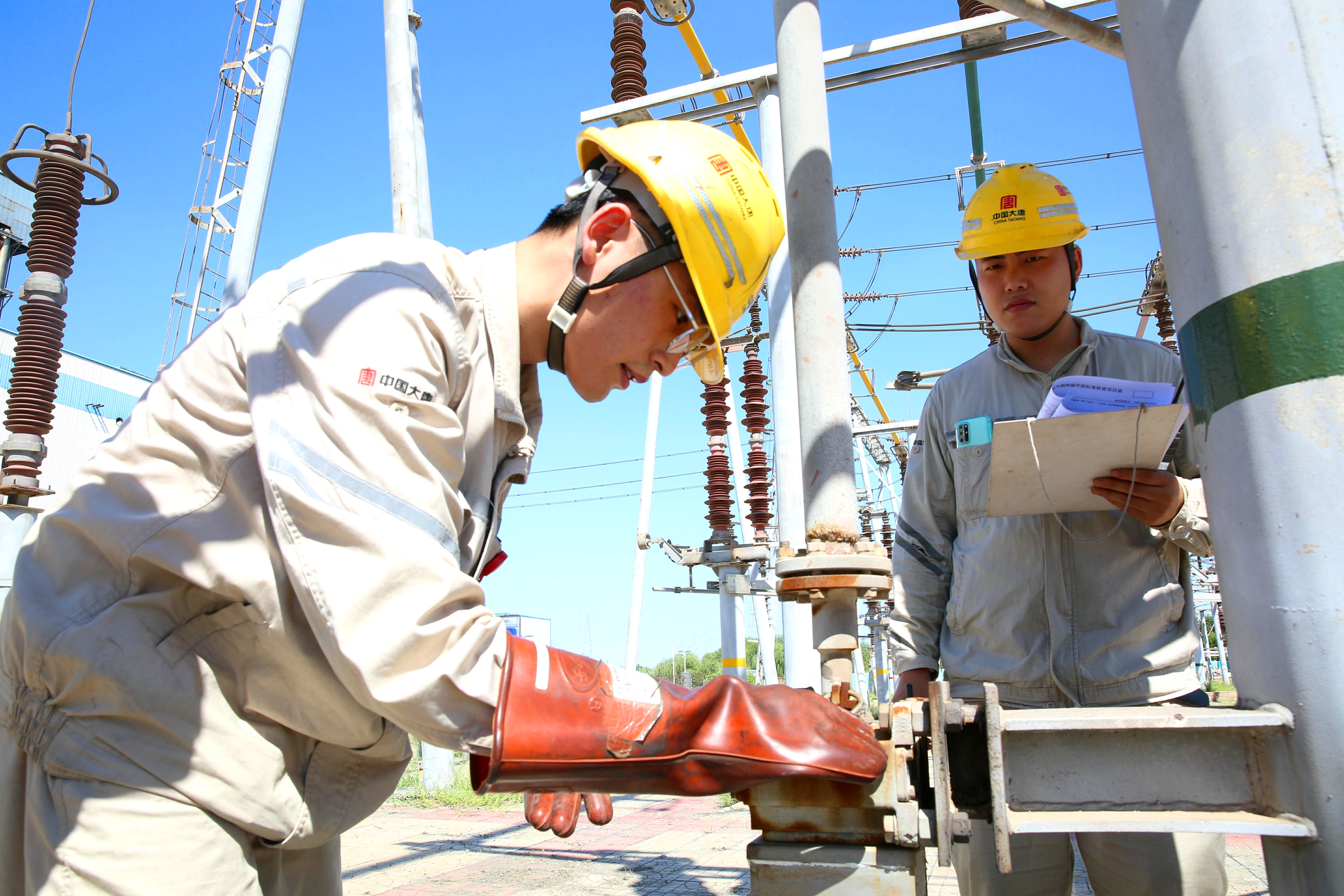 这是该公司升压站的检修现场。此时,室外温度已经蹿升至37摄氏度,火红的骄阳炙烤着现场的每一个人,大家的工装如同洗了一般被汗水浸透。